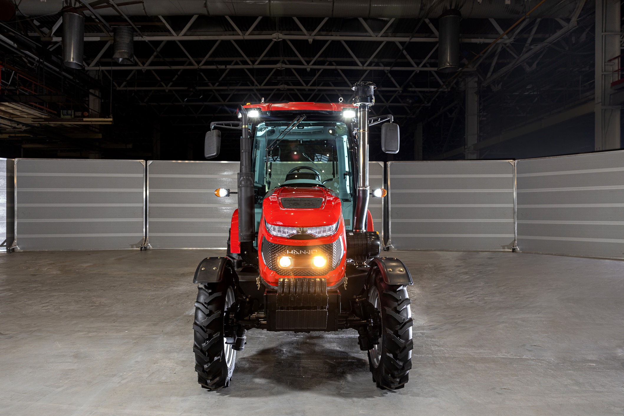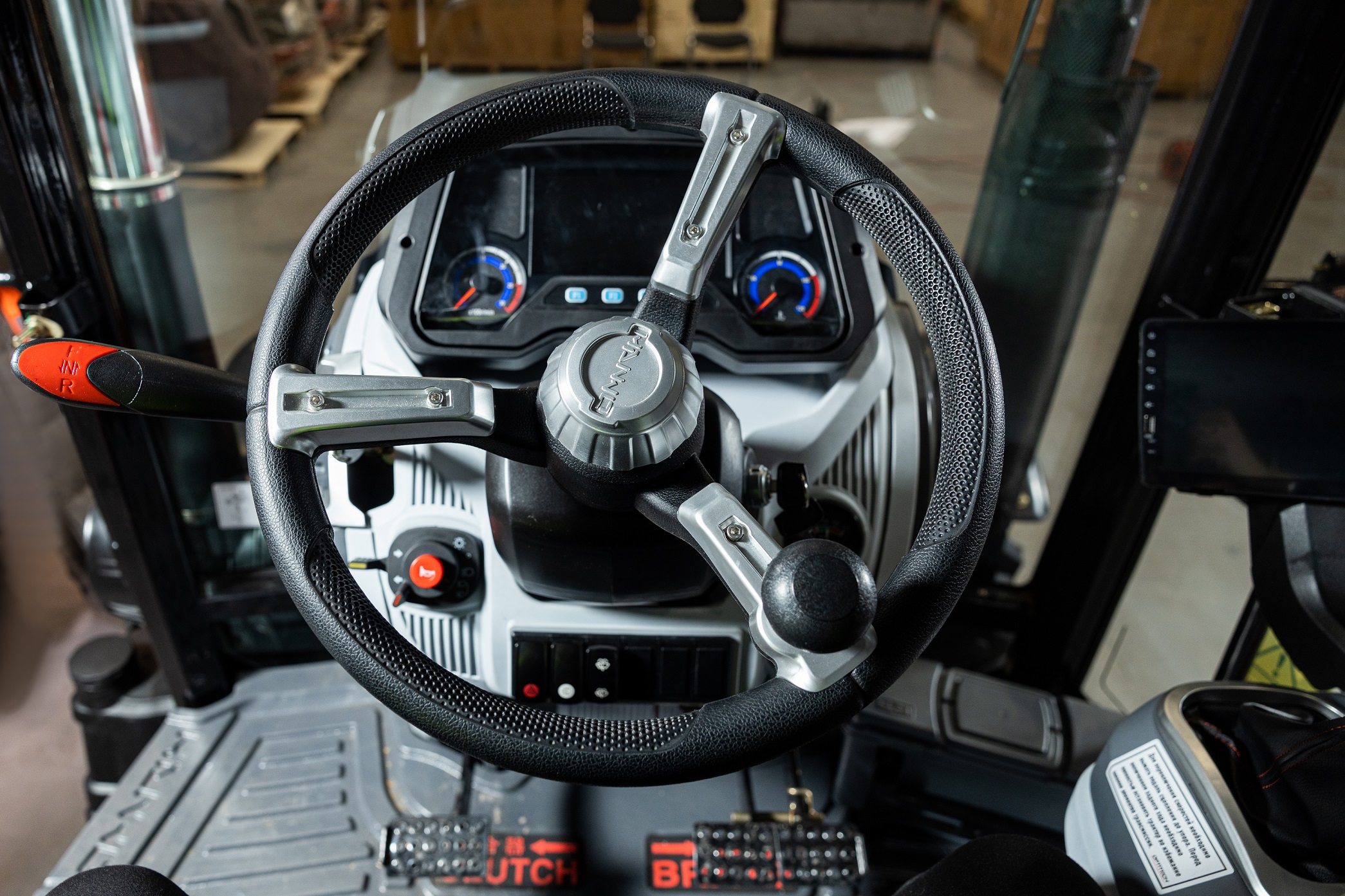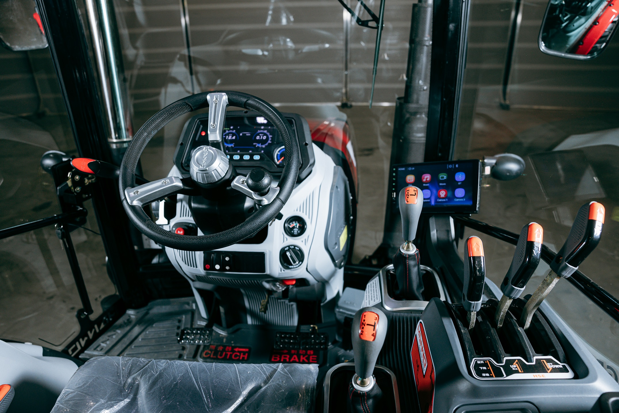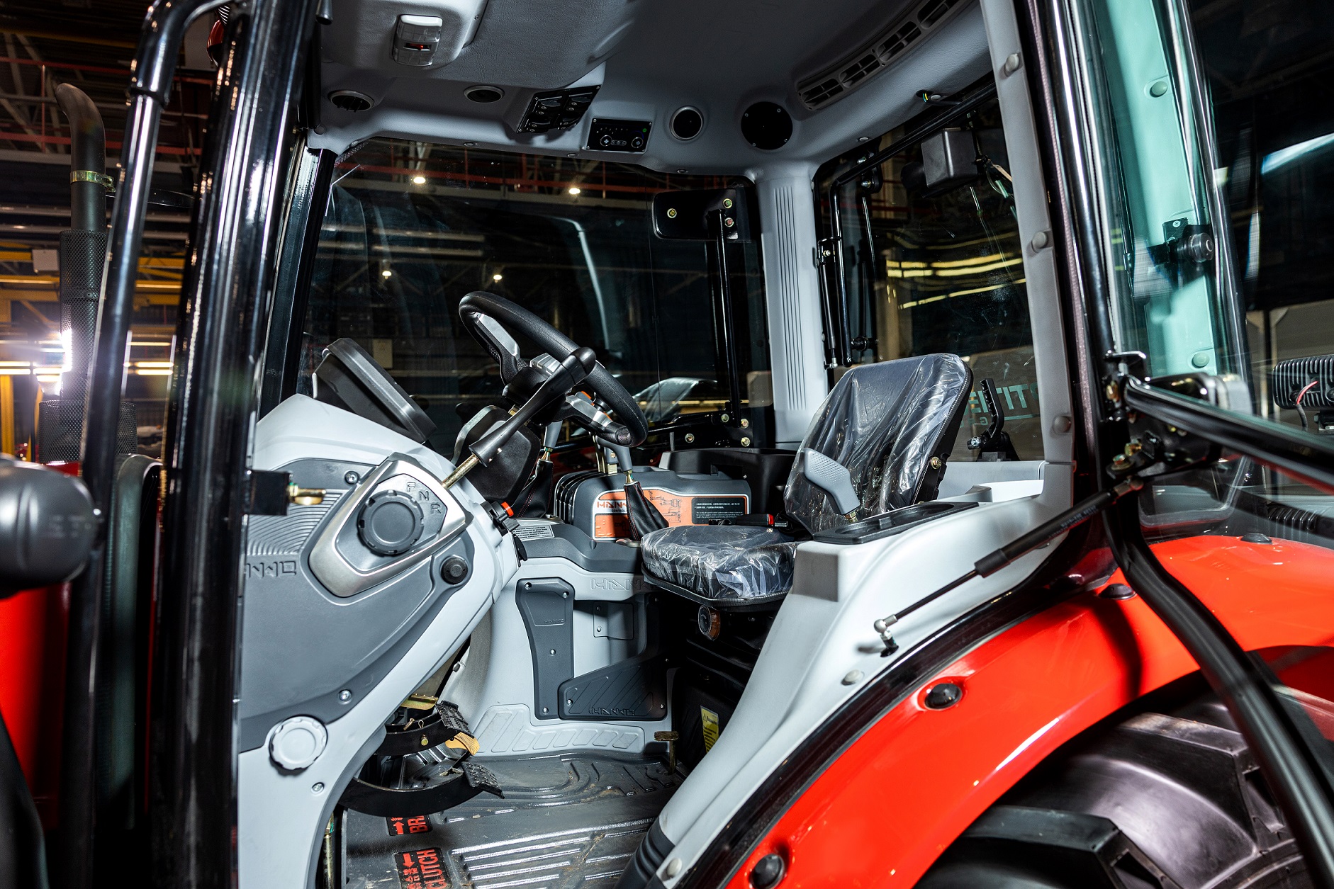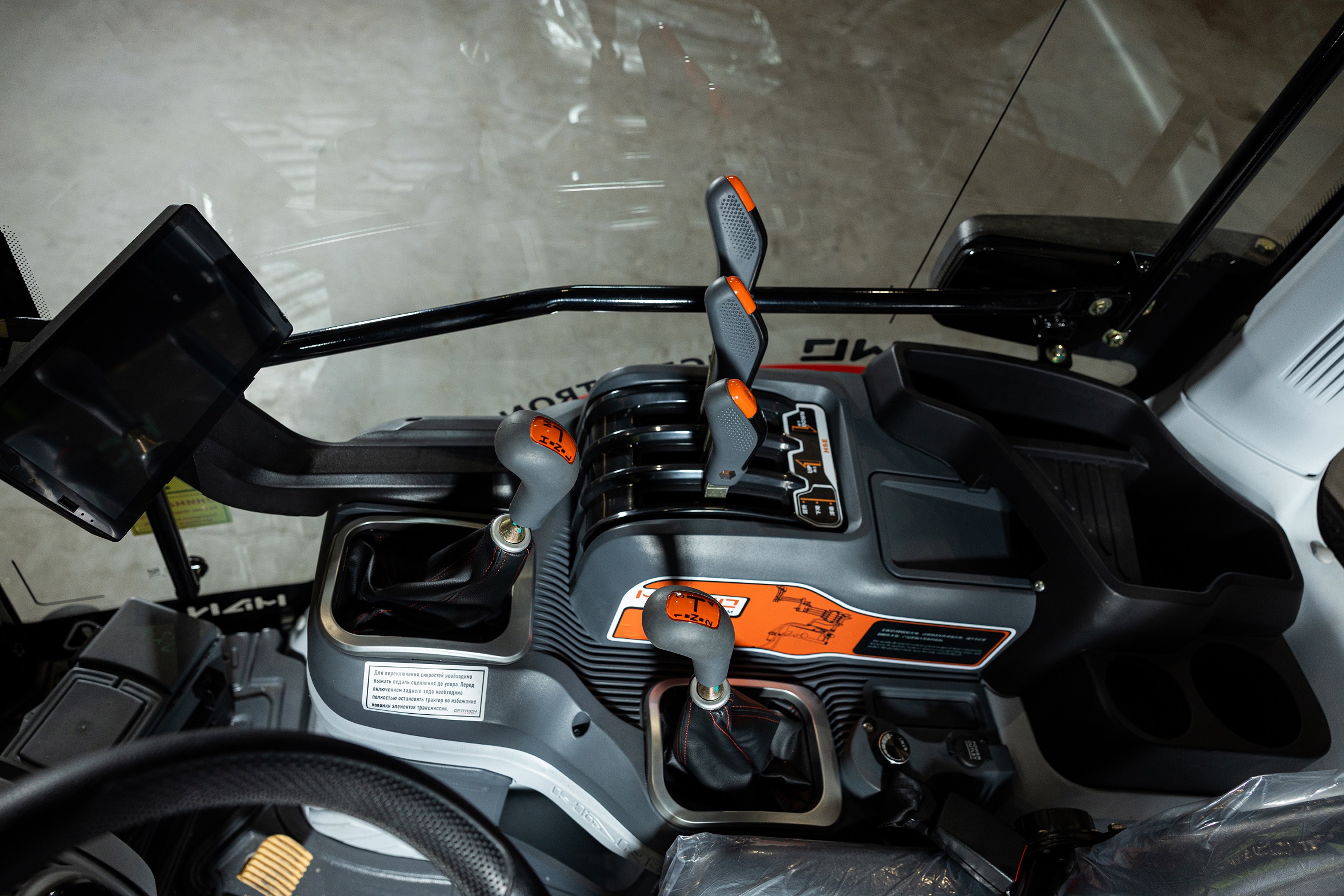 Отдельного внимания достойна кабина оператора. Несмотря на компактные размеры трактора, рабочее место получилось полноразмерным и эргономичным. Управление передачами и гидравликой удобно вынесено под правую руку. В комплектацию входит кондиционер, цветной дисплей с радио, магнитолой и видеопроигрыватель.