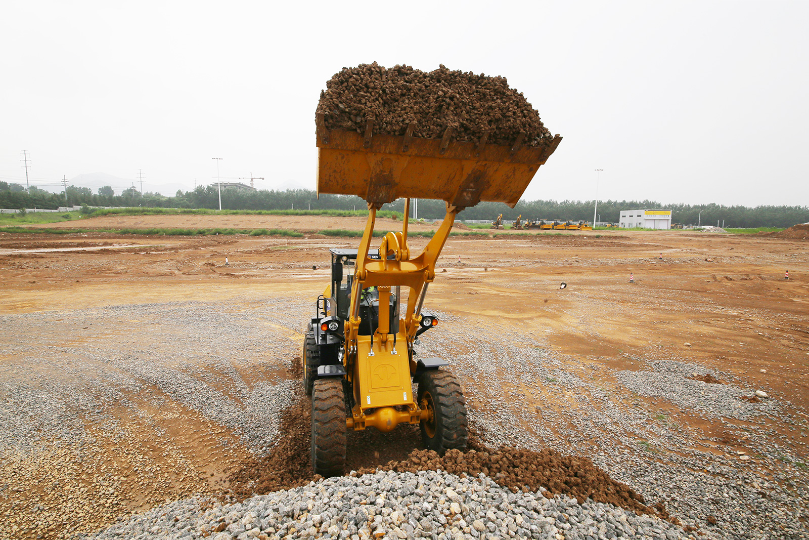 Высота подъема ковша достигает 3200 мм, а выгрузки — 3916 мм. Это удобно для загрузки материалов в транспорт с высокими бортами, например в зерновозы. Четыре скорости вперед и столько же назад позволяют выбрать оптимальный режим для работы на ограниченной площадке или для быстрого перемещения между объектами. Погрузчик использует шины размером 17,5-25.
